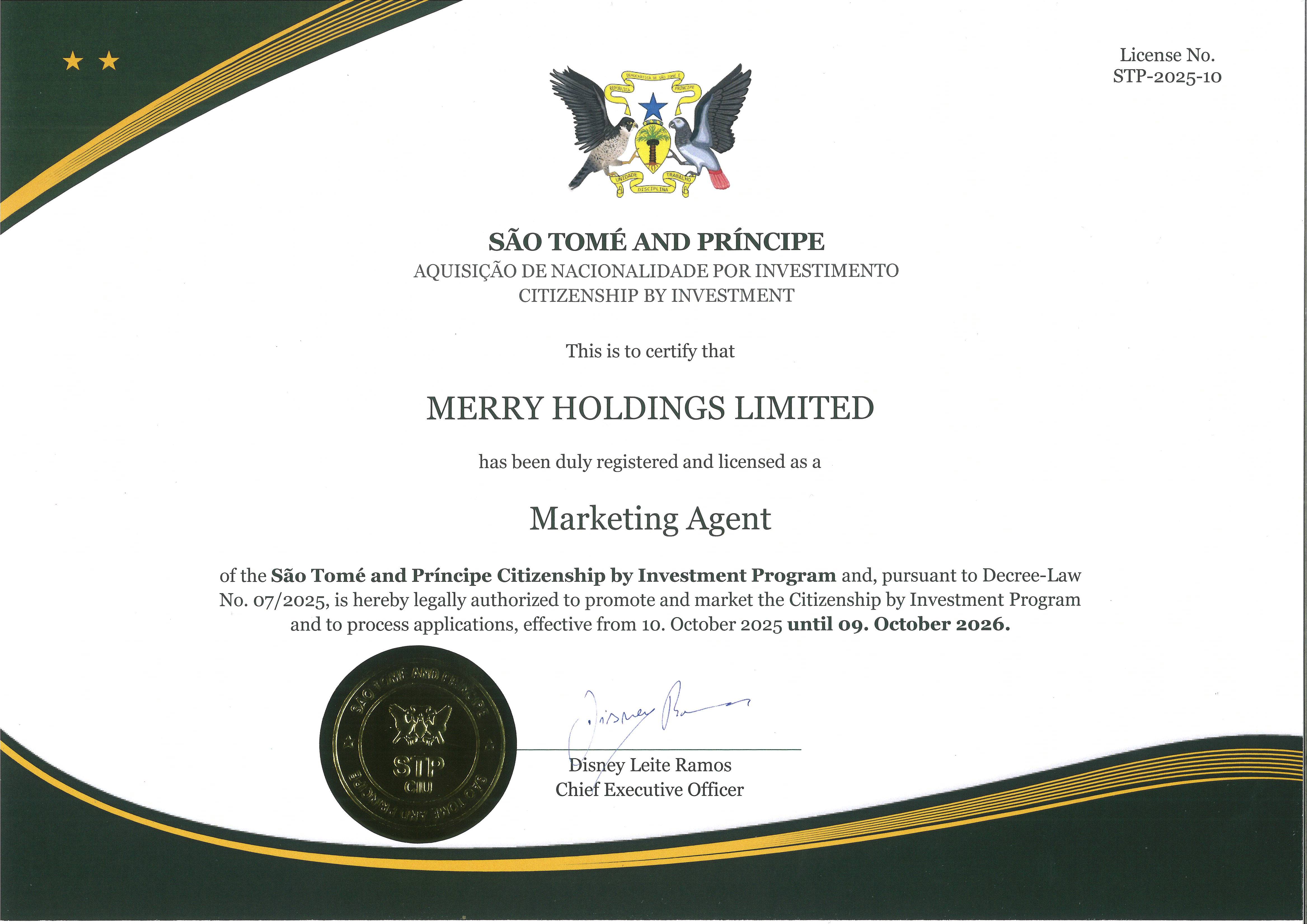 美瑞海外MERRY圣多美授权代理证书