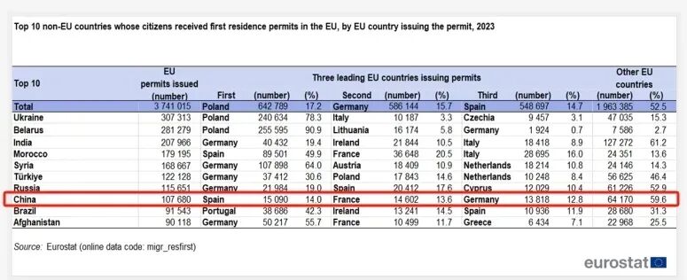 根据欧盟统计局的数据,2023年向非欧盟公民发放了370多万份首次居留许可,比2022年增长4.7%,创下历史新高。